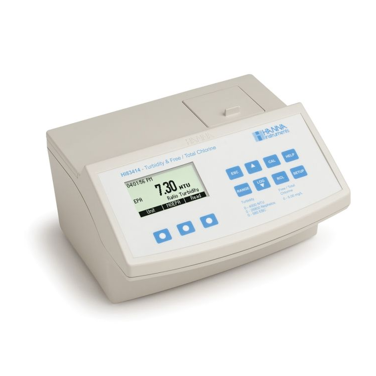 濁度標準組及氯NIST測量曲線標定組,保存和使用應在18 to 25°C(64.5 to 77°F)溫度范圍內,非Hanna 品牌專用濁度標準組及氯NIST測量曲線標定組會造成內置標準曲線嚴重漂移,甚至會損壞儀器。HI83414 微電腦余氯-總氯-濁度測定儀技術參數: